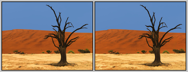Das Deadvlei ist eine kleine von Dünen eingeschlossene Tonpfanne. Markant sind die 900 Jahre alten schwarz verkohlten Kameldorn-Bäume auf gelbem Sand vor den roten Dünen der Namib. DAS Postkartenmotiv Namibias!