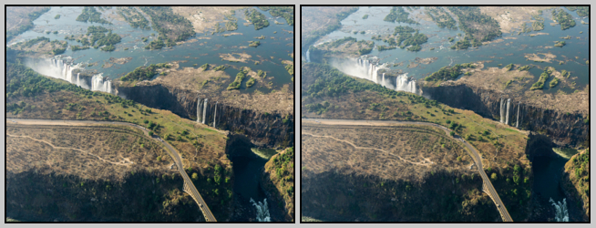 Ein Flug mit dem Hubschrauber ergab die Möglichkeit für Stereofotos im Sukzessiv-Verfahren. Um diese Jahreszeit (im Oktober) führt der Sambesi wenig Wasser.